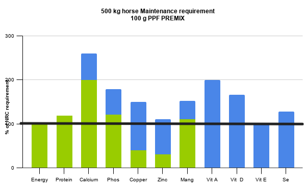The graph below shows an average quality grassy hay topped up with the PPF premix. The black horizontal bar is the amount of nutrients required as per NRC (Nutrient Requirements of the horses published by the National Research Council in 2007).