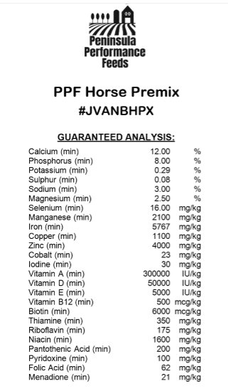 NEW: We’re happy to announce we’ve added a quality powdered horse mineral premix to our product line. It’s perfect for adding a concentrated source of nutrients to your program. Just 100 grams per day will meet and exceed the maintenance mineral and vitamin requirements of a 500 kg horse. At just $65 dollars per bag this is an economical way to balance a feed program. It can be used as the sole source of minerals and vitamins for horses on a forage first ingredient program or with an unfortified grain mix. Cost is under 30 cents per horse per day.